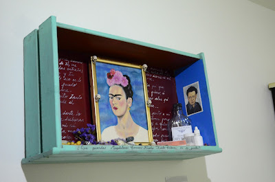 de Frida Kalho con su tequila, frases, medicamentos, flores y collares, pasando